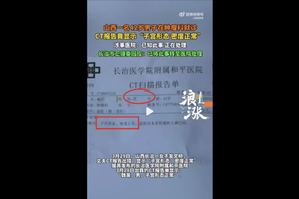 近日,山西长治医学院附属和平医院发生了一起引发广泛关注的医疗失误事件。一名男性患者在接受CT检查后,竟在报告单上看到“子宫形态、密度正常”的字样,这一错误的描述与患者的生理特征完全不符,令其家属感到震惊与愤怒。