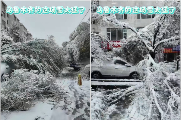 多位乌鲁木齐的网友分享了现场视频,显示暴雪造成了路边和小区内许多树木被压倒,树枝断裂,甚至有车辆被砸在树下。6日早上7时,乌鲁木齐市气象台将暴雪黄色预警升级为橙色预警,警示市民注意安全。