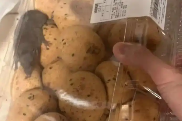 消费者在社交媒体上分享了她的购物经历,并附上了照片。照片显示,在一个密封的透明塑料盒中,一只深灰色的活老鼠正趴在麻薯之间,而部分麻薯的表面则出现了不规则的凹陷和缺损,似乎是被老鼠啃过的痕迹。