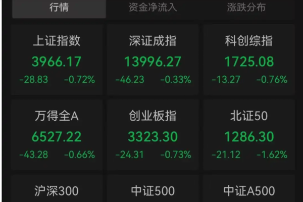 在4月9日的交易中,A股市场经历了显著震荡,主要指数全线走低,沪深两市的总成交金额缩至3004亿元人民币。收盘时,沪指下跌0.72%,报3966.17点;深证成指则微跌0.33%,报13996.27点;创业板指亦下滑0.73%,收于3323.30点。此外,北证50指数的跌幅达到1.62%。